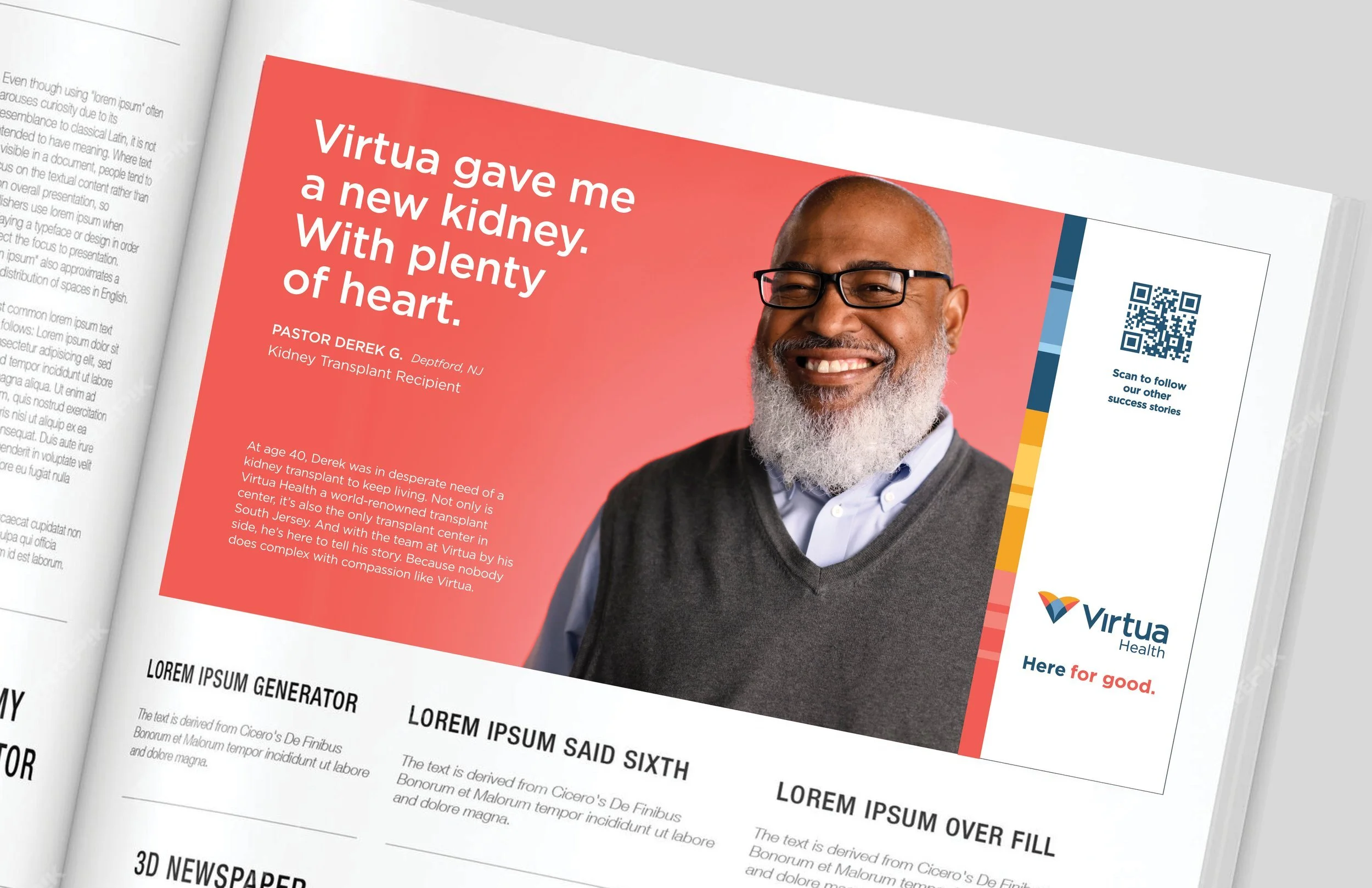 Virtua Health’s “Here for Good” brand strategy is a perfect articulation of who they are and what they do. They’re everybody’s go-to for their daily and yearly healthcare needs. And, they are incredibly involved in the community too. But what about complex cases, like cancer, and transplants, and heart and vascular trauma? The strategy was to let people know that Virtua does the “tough stuff” too. No need to go across the river the Penn, when Virtua’s right in your own backyard. This “we play hardball, too” campaign campaign elevated the Brand, achieving consistent growth and a rise in consumer preference rankings. This campaign was made with real patients and real doctors, telling their real stories. Life threatening situations. Life-changing experiences. I'm not sure who was more grateful for the other.